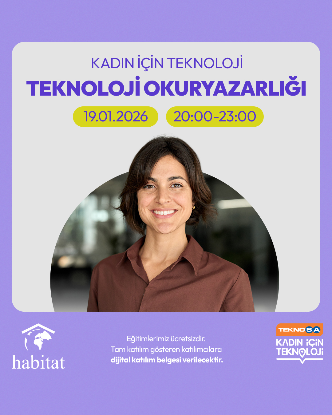 Kadınların ekonomik ve sosyal hayata daha çok katılım sağlaması için gerekli olan teknolojik araçları daha iyi kullanmaları ve dijital dünyayla yakınlaşmalarını amaçlayan Kadın için Teknoloji Projesi kapsamında Teknoloji Okuryazarlığı eğitimi gerçekleştirilecektir.